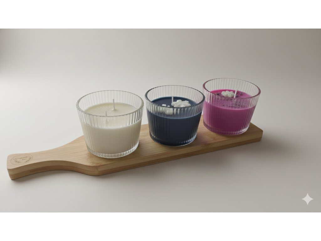 Minimalistický set pro rituál klidu a lásky. Obsahuje elegantní dřevěnou podložku a tři sójové svíčky (Bílá, Modrá, Růžová), z nichž každá má specifický záměr pro duši. Ideální pro harmonizaci prostoru a navození pohody. Vše ručně lité a 100% přírodní.
